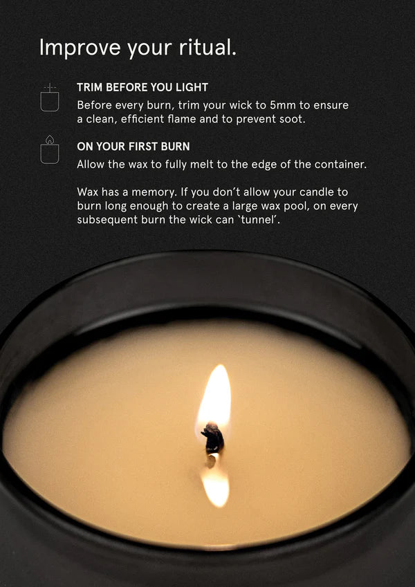 • First Burn . Keep alight for approx. 2-3 hours to create a wide, even wax pool and prevent tunnelling.