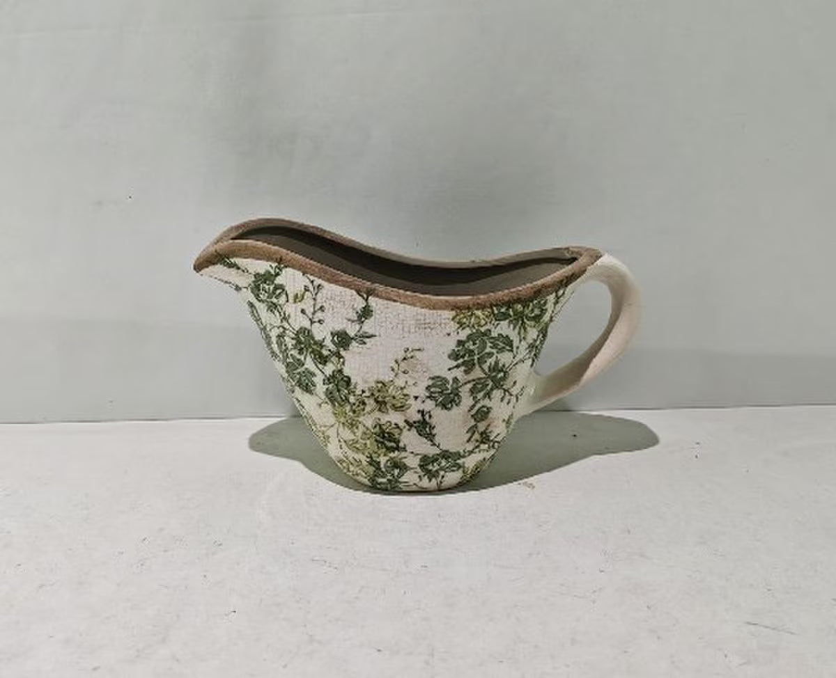 A charming ceramic jug featuring a soft green floral design, perfect for bringing a touch of nature indoors.